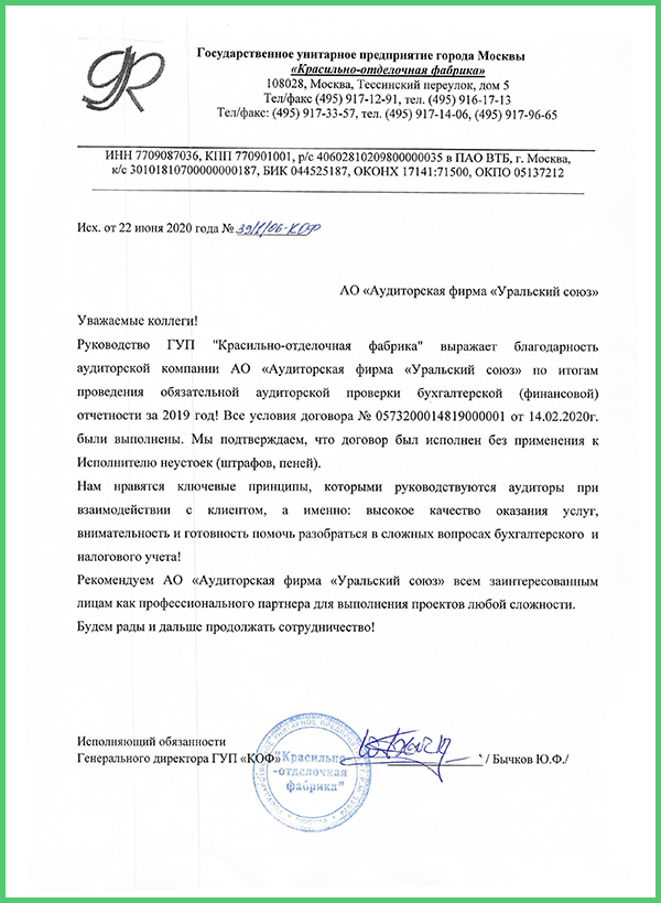 "...Руководство ОАО «Института пластмасс» выражает искреннюю признательность руководству и коллективу ЗАО «Аудиторская фирма «Уральский союз» за высокое качество предоставляемых услуг в области...