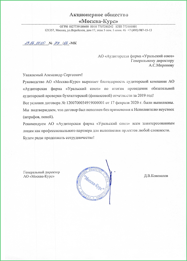 "...Уровень оказанных нам услуг свидетельствует о профессионализме специалистов компании,а также высоком уровне клиентоориентированности...считаем возможным рекомендовать «Уральский союз» для...