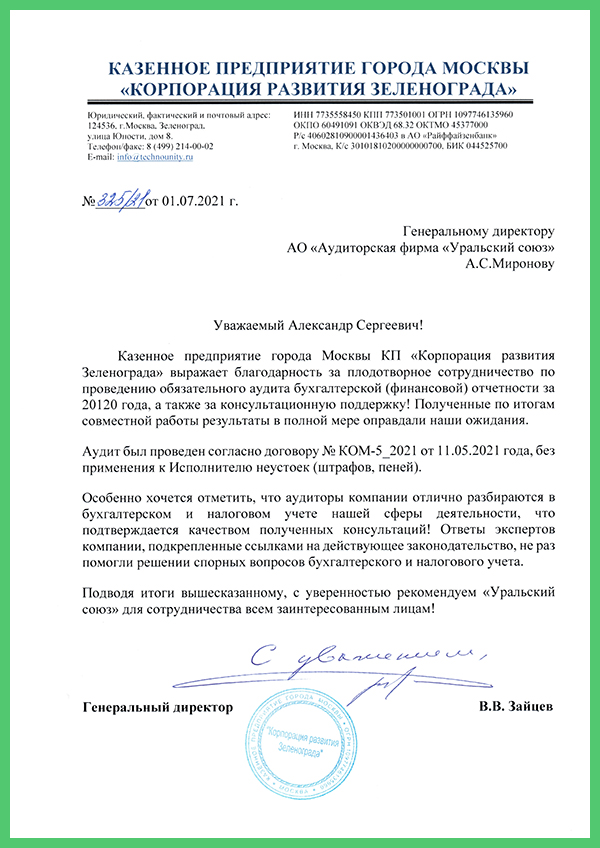 "...Уровень оказанных нам услуг свидетельствует о профессионализме специалистов компании,а также высоком уровне клиентоориентированности...считаем возможным рекомендовать «Уральский союз» для...