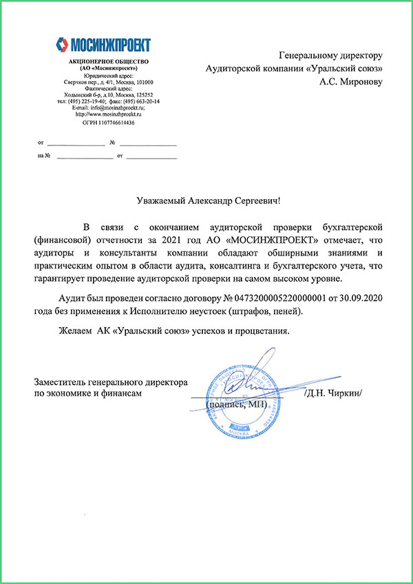 "...Руководство ОАО «Института пластмасс» выражает искреннюю признательность руководству и коллективу ЗАО «Аудиторская фирма «Уральский союз» за высокое качество предоставляемых услуг в области...