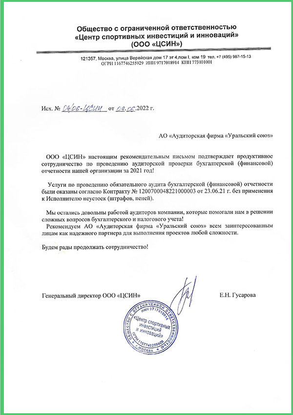 "...Уровень оказанных нам услуг свидетельствует о профессионализме специалистов компании,а также высоком уровне клиентоориентированности...считаем возможным рекомендовать «Уральский союз» для...