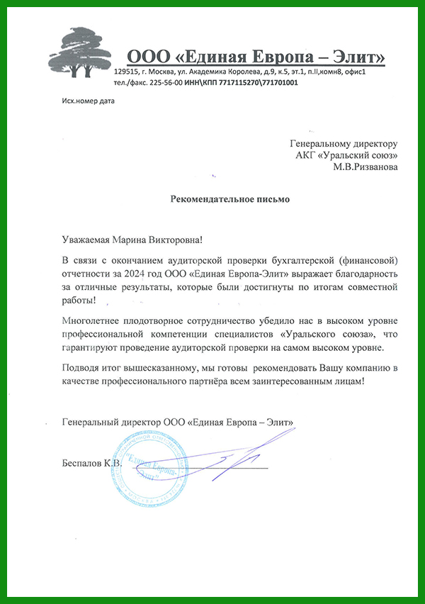 "...Уровень оказанных нам услуг свидетельствует о профессионализме специалистов компании,а также высоком уровне клиентоориентированности...считаем возможным рекомендовать «Уральский союз» для...
