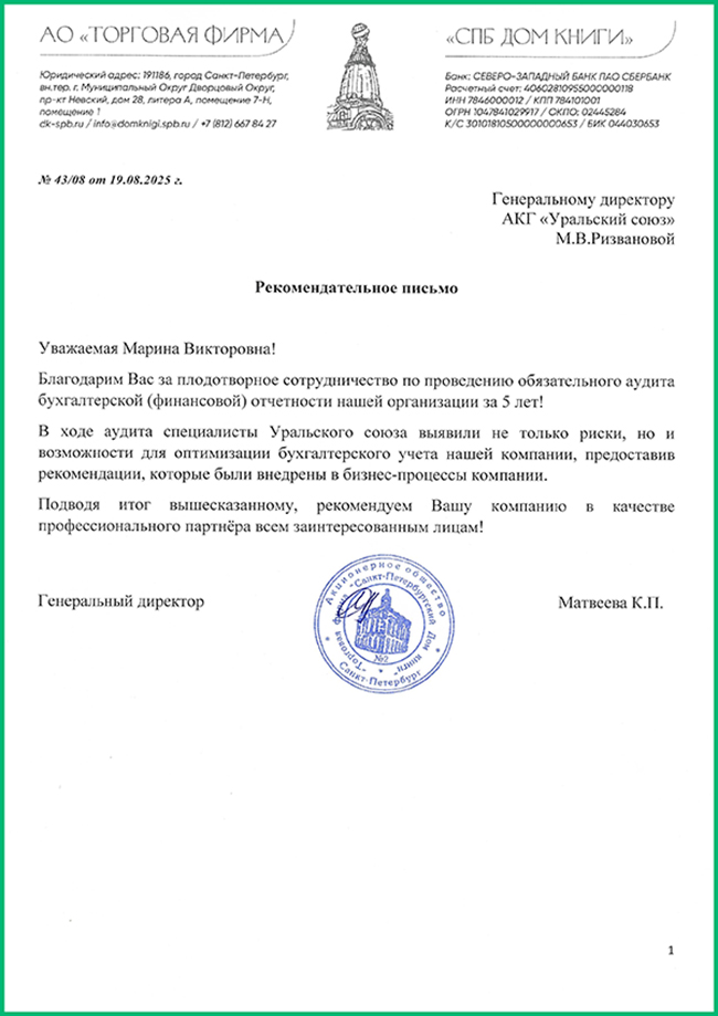 "...Уровень оказанных нам услуг свидетельствует о профессионализме специалистов компании,а также высоком уровне клиентоориентированности...считаем возможным рекомендовать «Уральский союз» для...